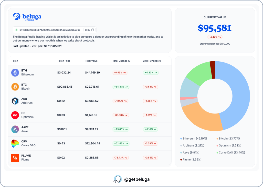 Tough few weeks for the Beluga portfolio pushing us down to $95k, which doesnât come as much of a surprise given the sell off in ETH and BTC. What is surprising, however, is how rapidly our Plume holdings have started to slide in the last two weeks. Altcoins have certainly struggled this cycle but even I have to admit the PLUME chart is pretty brutal. For now the plan there stays the same, as I still believe theyâre a leader in the RWA sector and tokenization is one of the clearest narratives I see for crypto in the mid to long term.