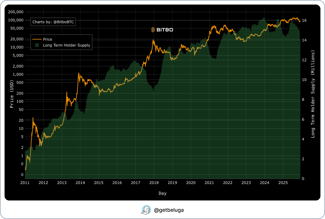 Aside from a sharp selloff-into-recovery during Asia hours, crypto markets were relatively quiet today with Bitcoin ending the day near the $90k mark. Something to keep an eye on is the trend of longer-term Bitcoin holders (LTH) (defined as wallets that have held for more than 6 months) slowly offloading their BTC over time. This may look bearish at first glance, but when comparing with previous cycles it presents a more interesting story: past cycle tops have coincided with a single major drop off in LTH, but this time we are seeing multiple distinct supply zones. This isnāt enough to fully conclude the market and cycle structures have changed (though personally I think they have), but itās a potentially powerful datapoint as we all try to decide whether or not āthe top is inā.