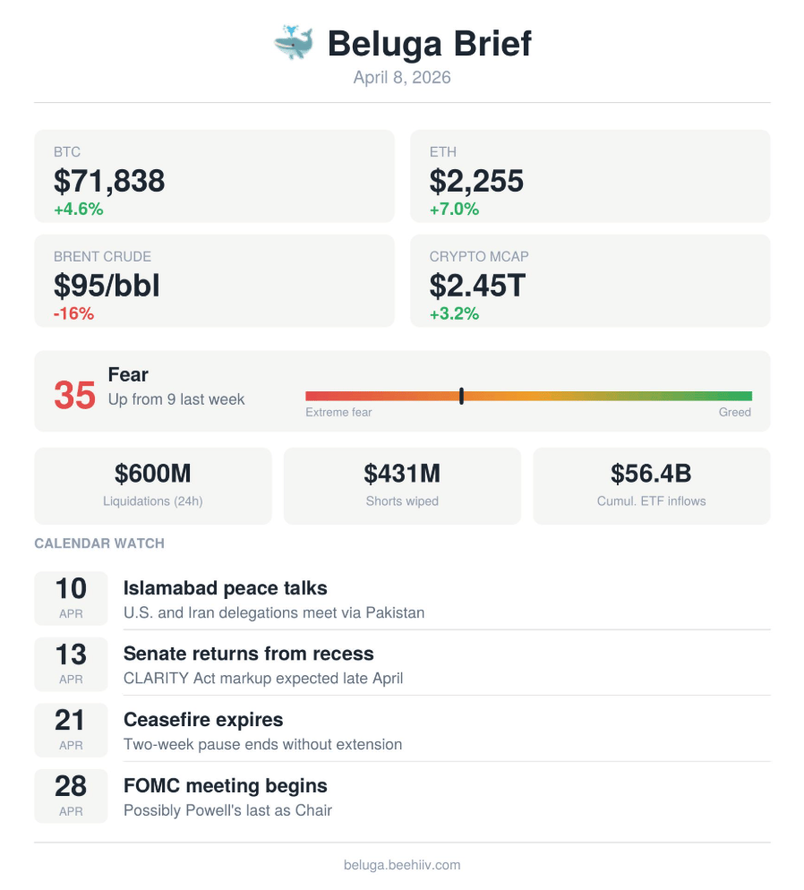 Markets reacted just as youâd expect, with oil erasing weeks of war premium in a matter of hours. The Brent spot price is now down 40% from last weekâs high of $141, and BTC ripped from $68k to almost $73k. While this is undoubtedly good news, itâs important to keep in mind that as of right now, this is just a two-week pause; if the two sides arenât able to make peace in the next 14 days, the expectation is for the fighting to continue.