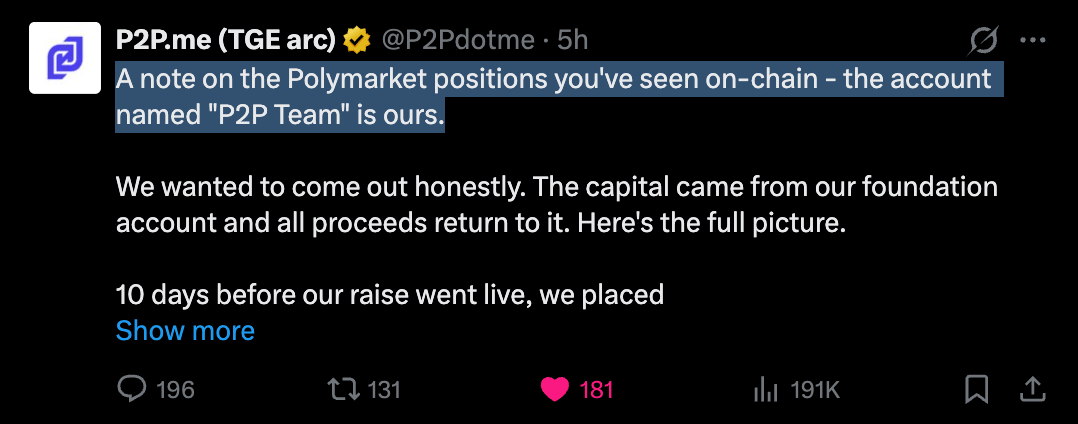 Before we wrap up the week, I wanted to highlight a funny story from the onchain world today: peer-to-peer onramp P2P.me caught attention for insider trading their own raise prediction on Polymarket. Ever since Polymarket began offering markets on raise totals there have been allegations of teams doing the same thing, but it’s usually hard to prove.
