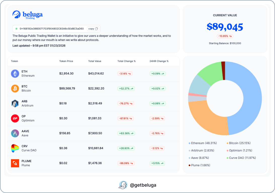 This may come as a surprise, but not much has changed in the Beluga wallet since Fridayās update. Weāre currently sticking to our gameplan until the market structure changes in a way that makes it appealing to bid new tokens again; until then Iād rather sit in more established plays and keep our riskier bets to a minimum.